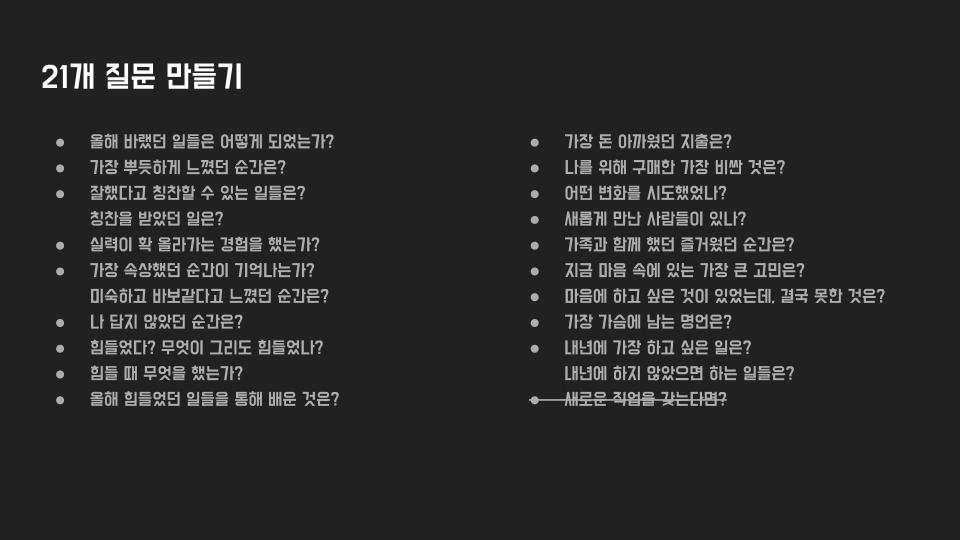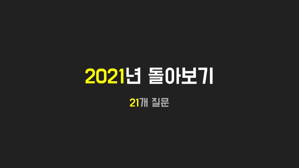 2021년은 21개의 질문에 답하는 방식으로 돌아보았다. 올해 바랬던 일들은 어떻게 되었는가? 가장 뿌듯하게 느꼈던 순간은? 잘했다고 칭찬할 수 있는 일들은? 실력이 확 올라가는 경험을 했는가? 올해 힘들었던 일들을 통해 배운 것은? … 내년에 가장 하고 싶은 일은?